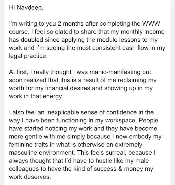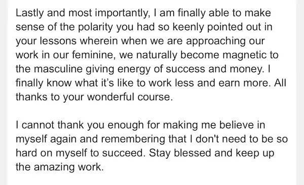 The reviews and earnings data shared on this page are from women who studied this course as guided through the modules. At various points in the course, I share suggestions on how you can make the best use of the lessons + practices it offers and apply them to see results in your life.